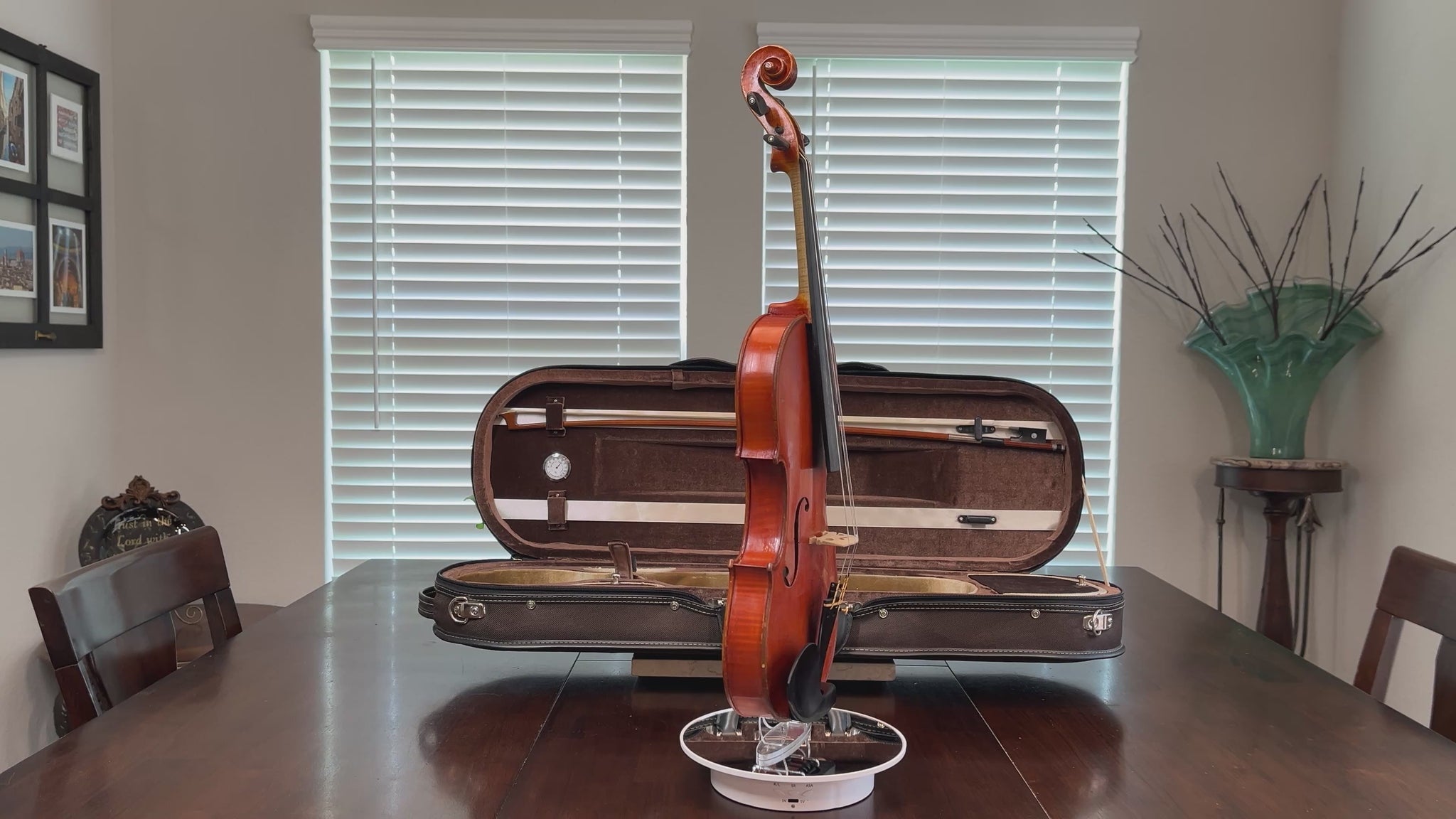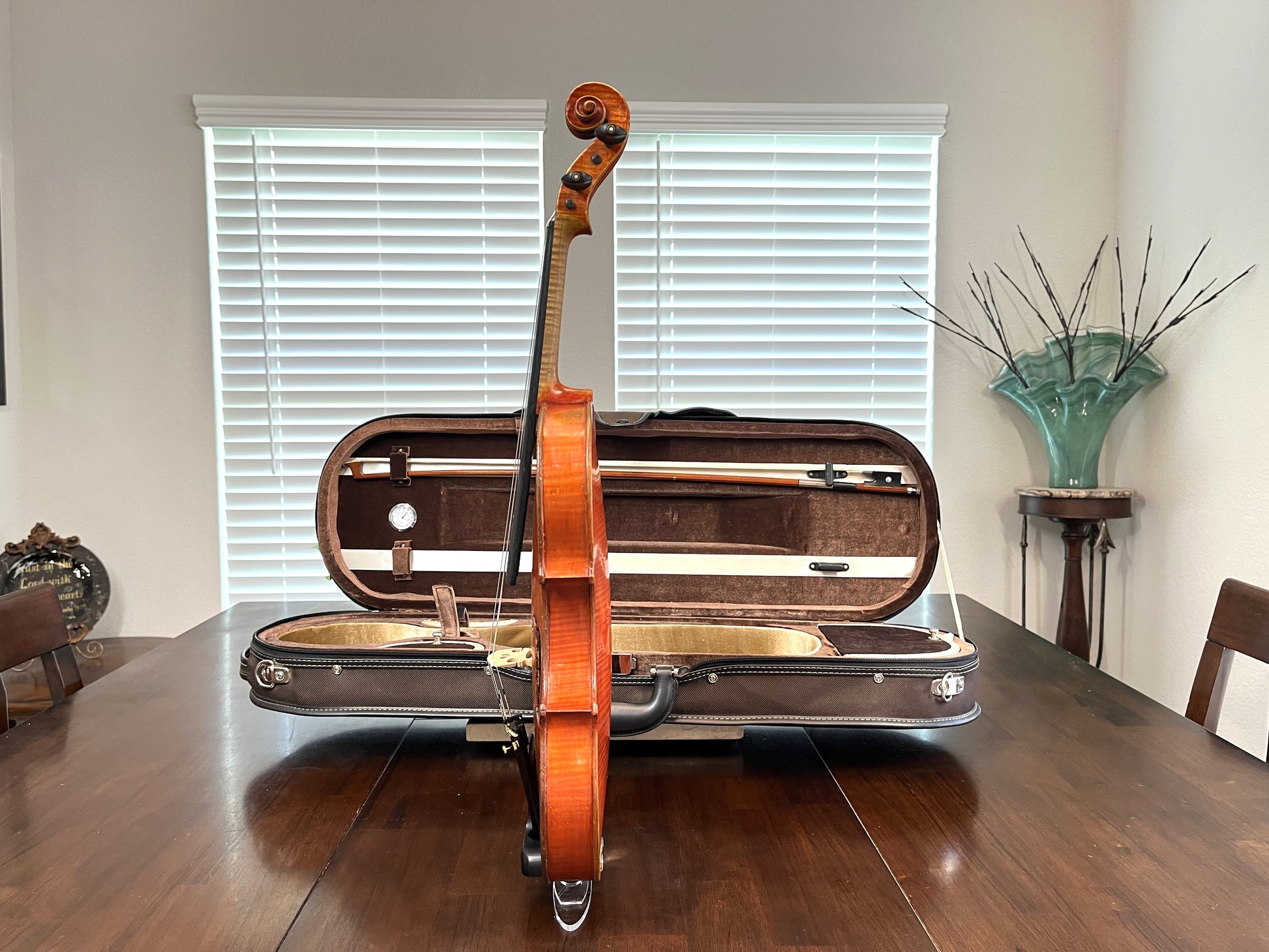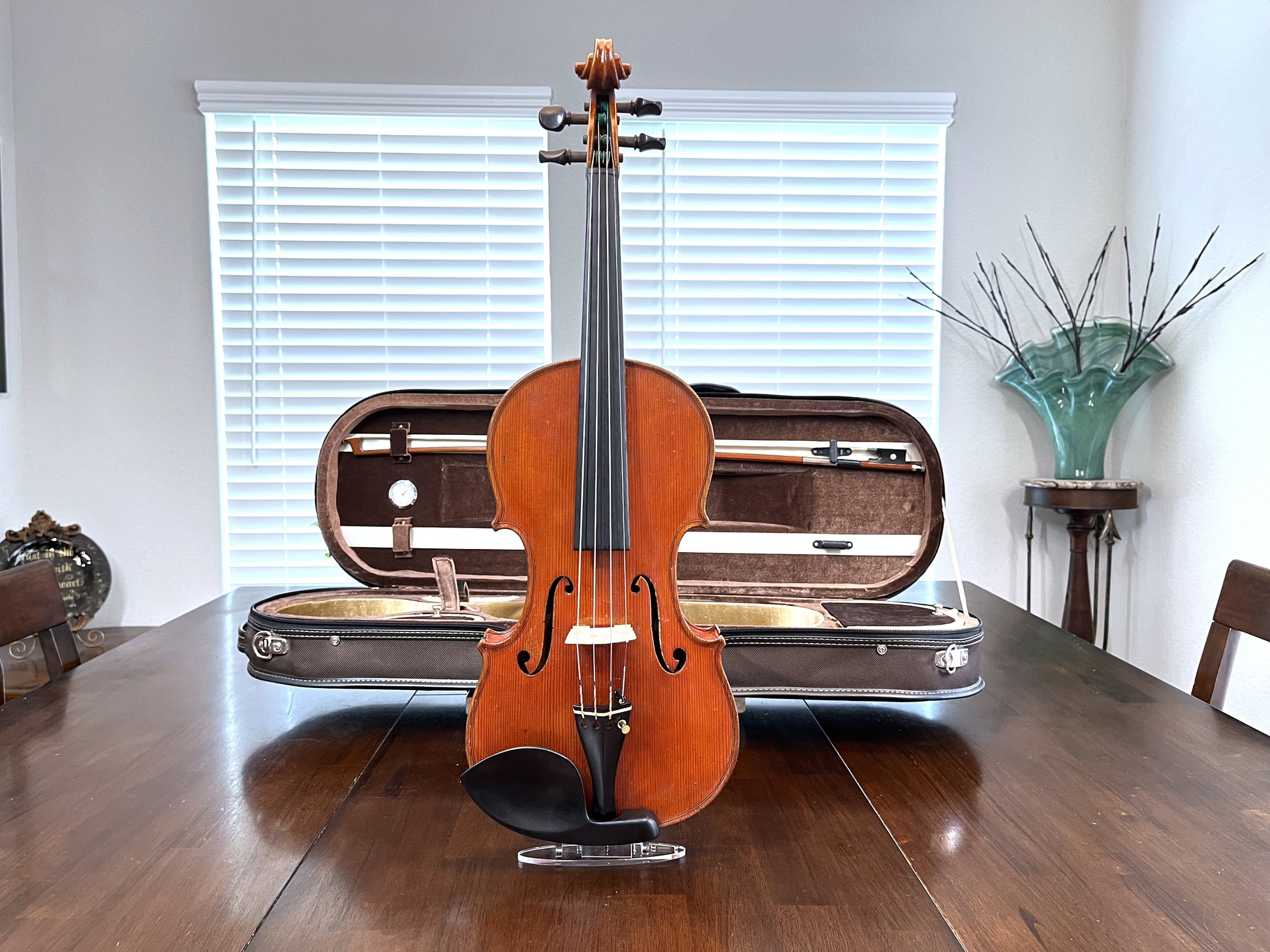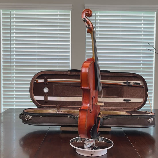 Why purchase new or rent when pre-owned sounds just as good! Did you know you can buy a quality pre-owned violin like this, and typically sell for the same price if kept in good condition? It’s like having a violin for free. You’re welcome to play prior to purchase. I’m happy to meet at a local music store in Burleson for a second opinion. We’re located in South Fort Worth, Texas. We look forward to meeting you! Shipping is protected, so if what you get, doesn’t meet the description you can send it back.