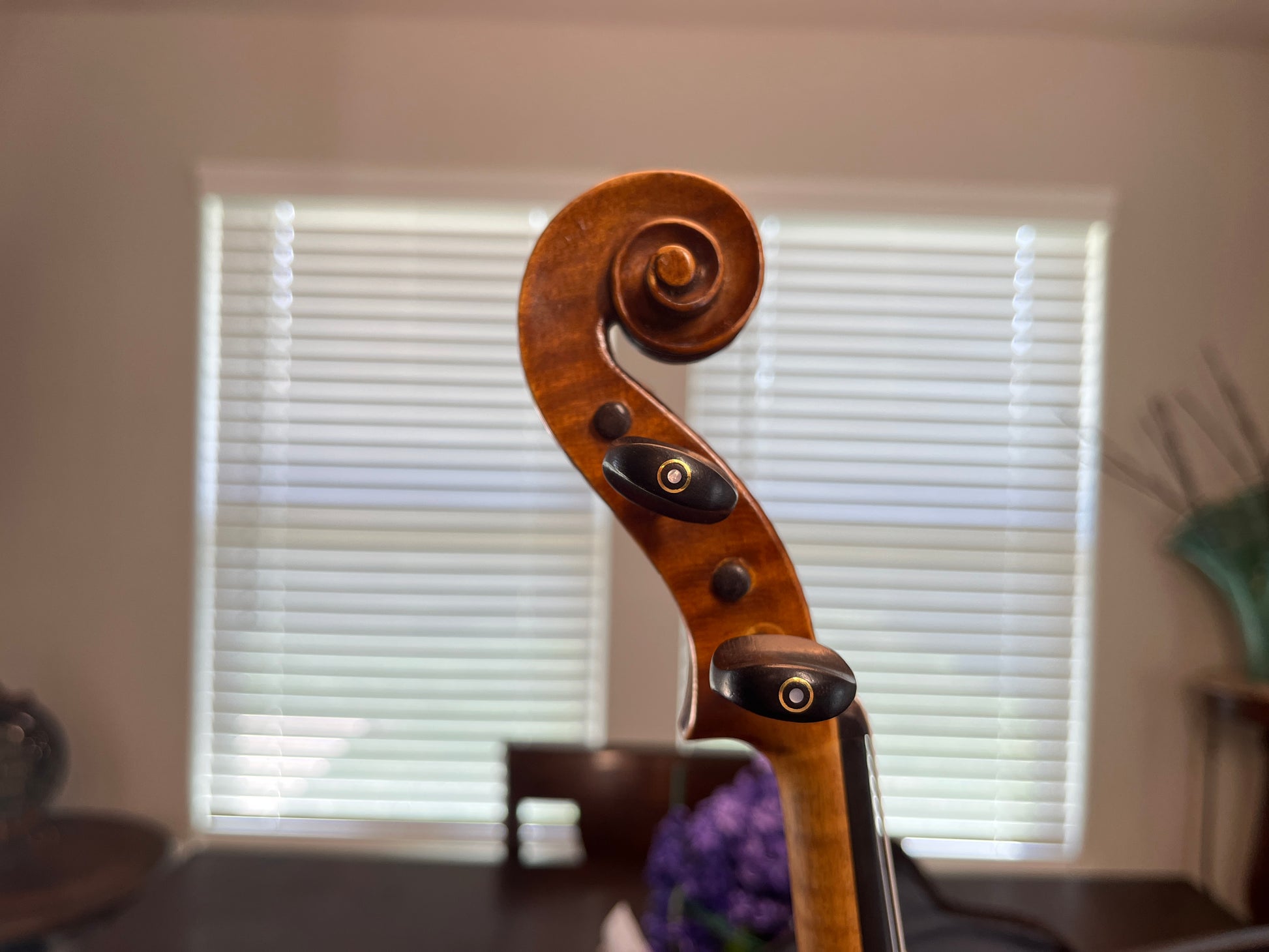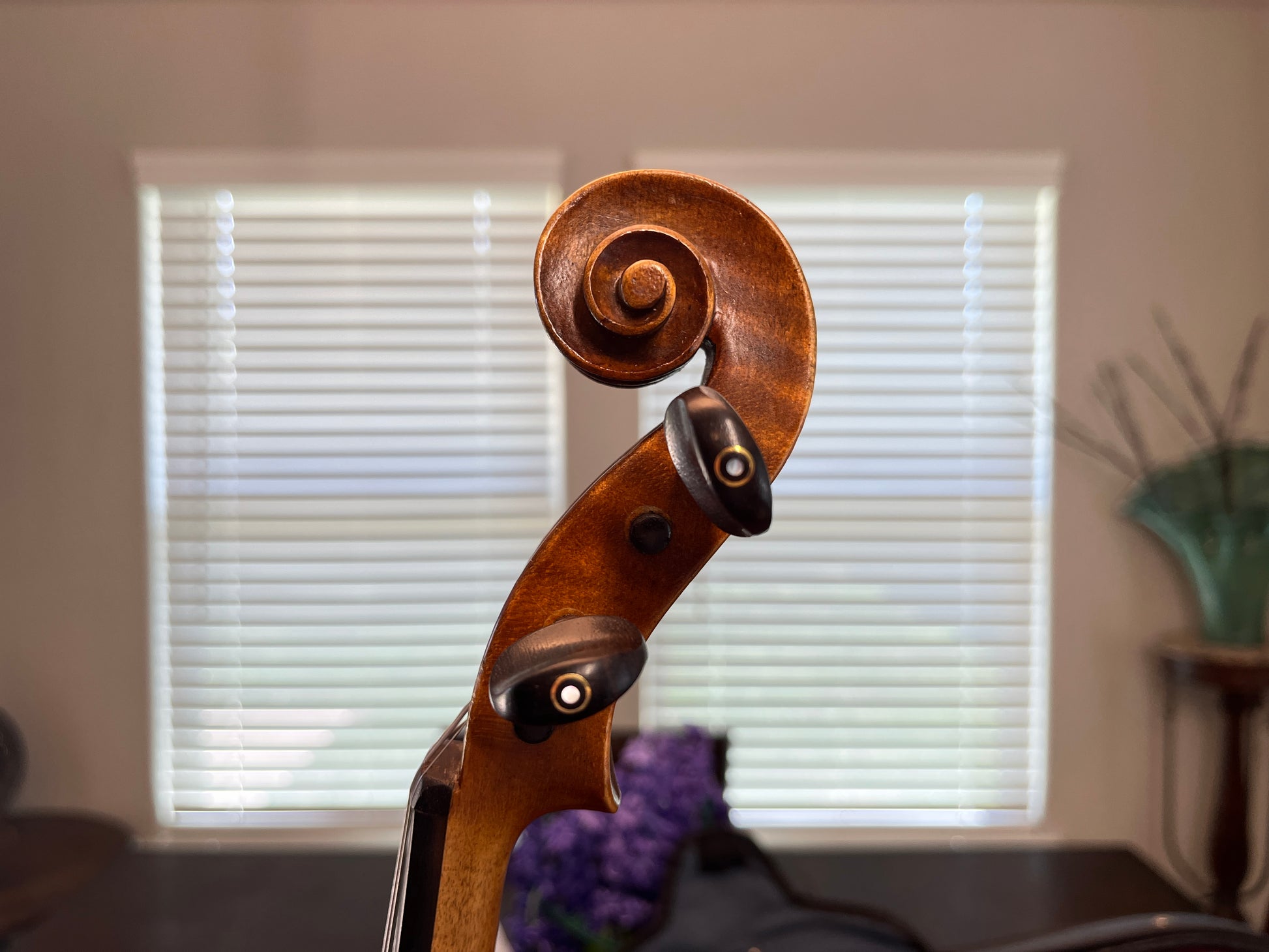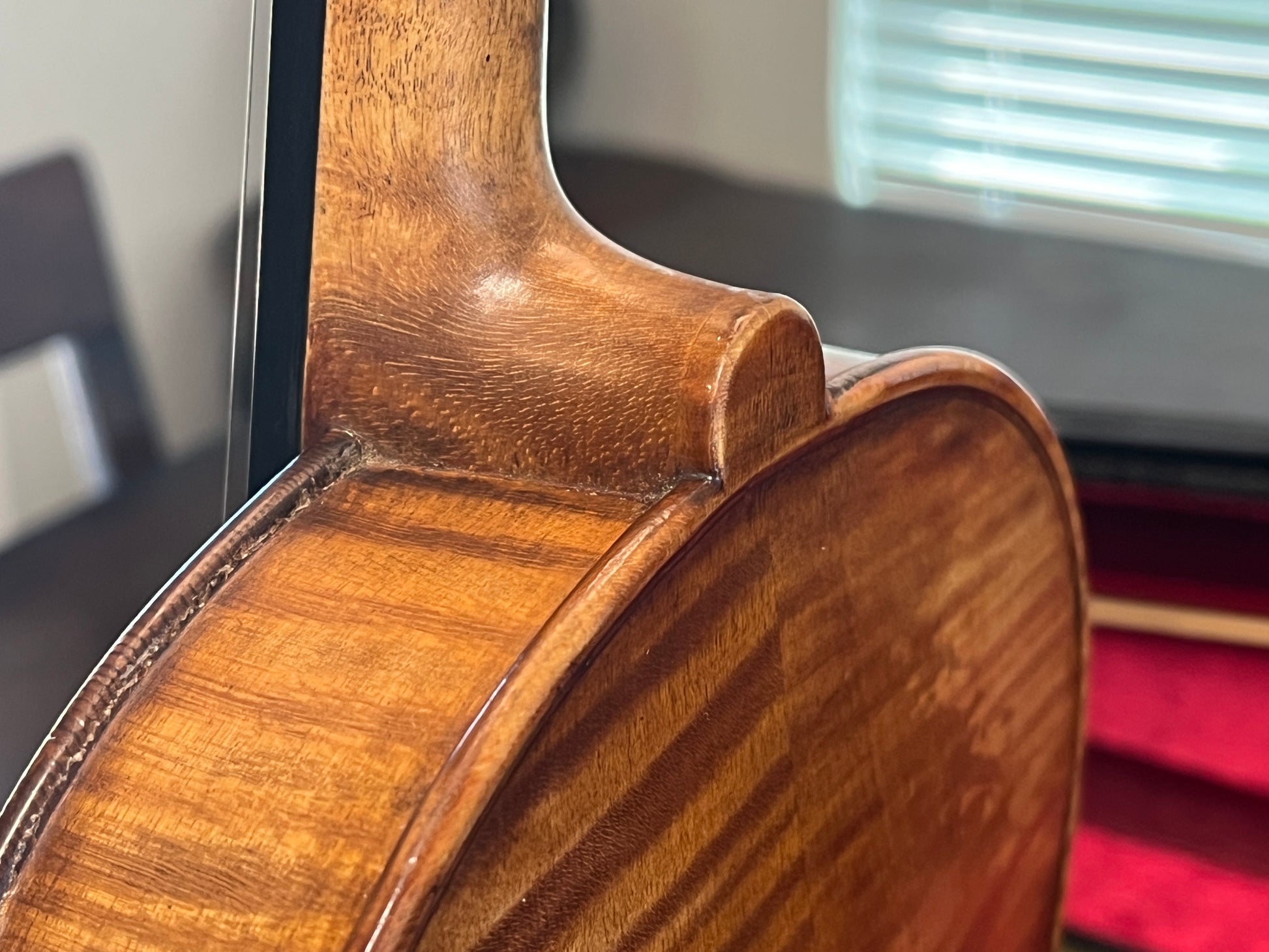 Has a repaired and bushed A peg on the treble side. Solid repair and holds well. Has reinforced inner cleat to extra protection. Repair shown in photos. This violin is ready to play for another 100 years!