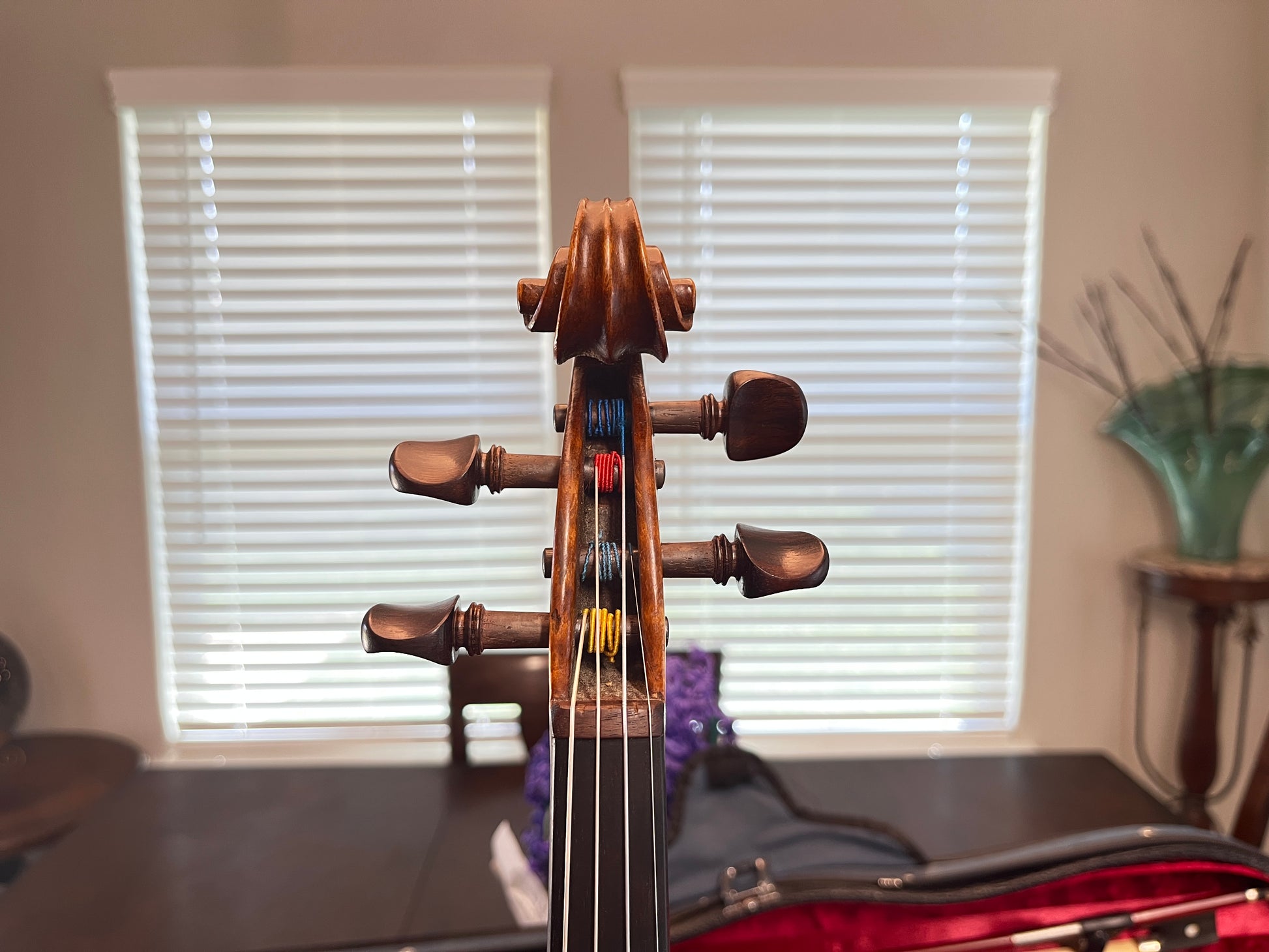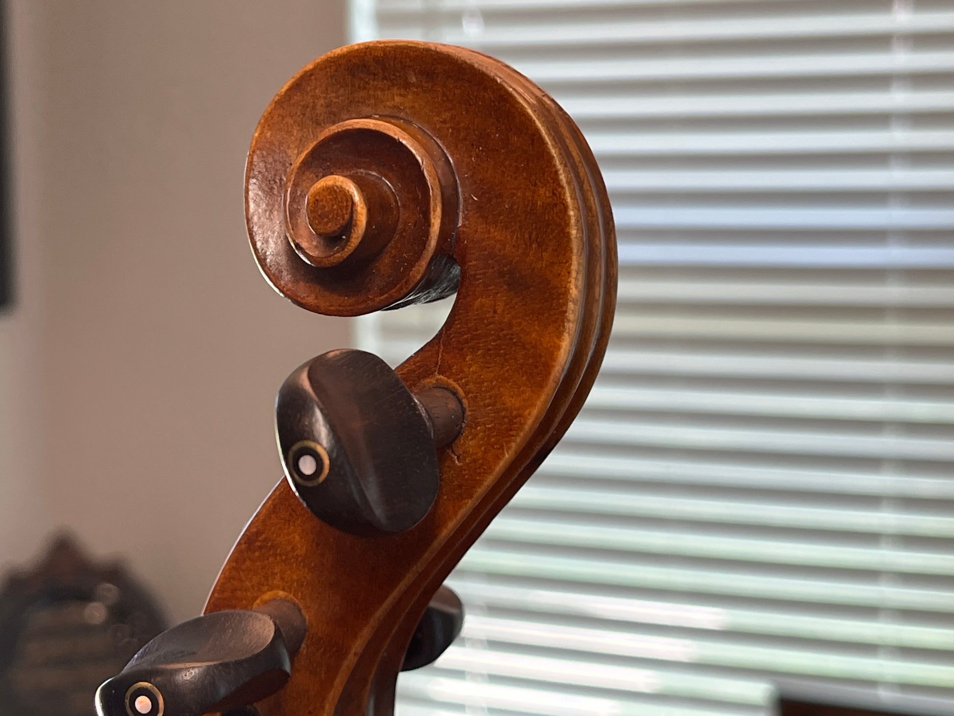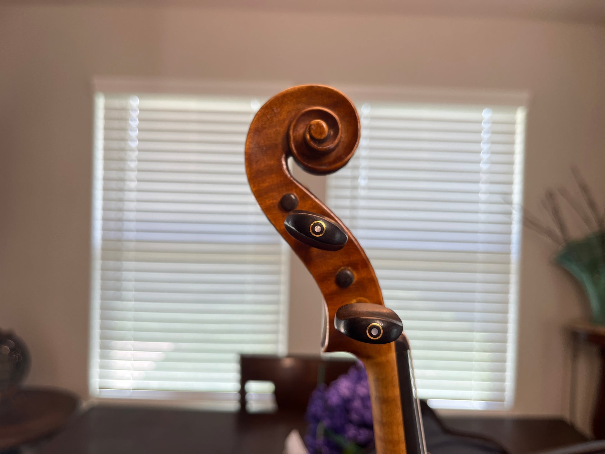 Has a repaired and bushed A peg on the treble side. Solid repair and holds well. Has reinforced inner cleat to extra protection. Repair shown in photos. This violin is ready to play for another 100 years!