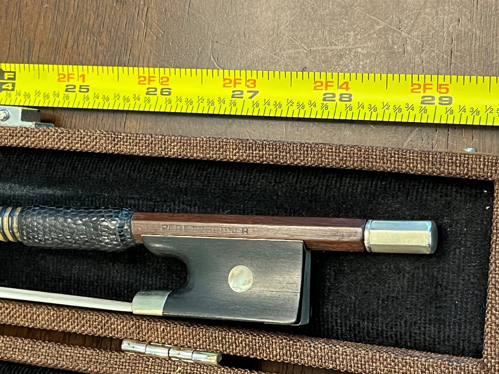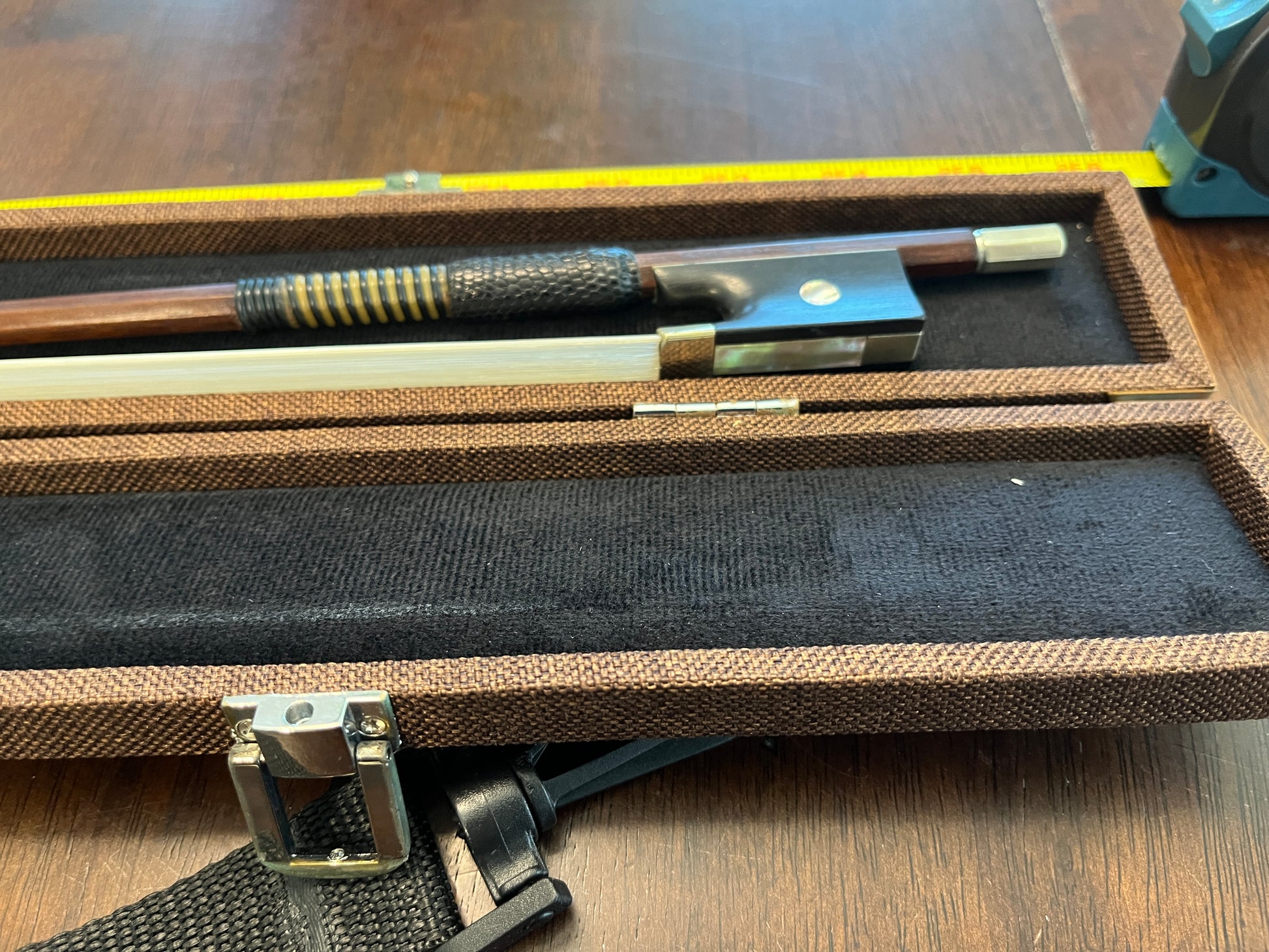 The bow was recently re-wrapped, re-gripped, and re-haired at a reputable local violin shop using premium stallion unbleached hair. The wrapping is faux whalebone and the leather is lizard for maximum durability.