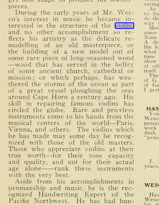 "During his early years he became interested in music and went from Portland, Ore., to Boston to study violin making, in which work he became known as a Master. Violins were sent to him to be repaired from Paris, Vienna, and other music centers. As a handwriting expert he was widely known and handled hundreds of cases. Men of high standing in the profession consider that his work ranks among the very finest."