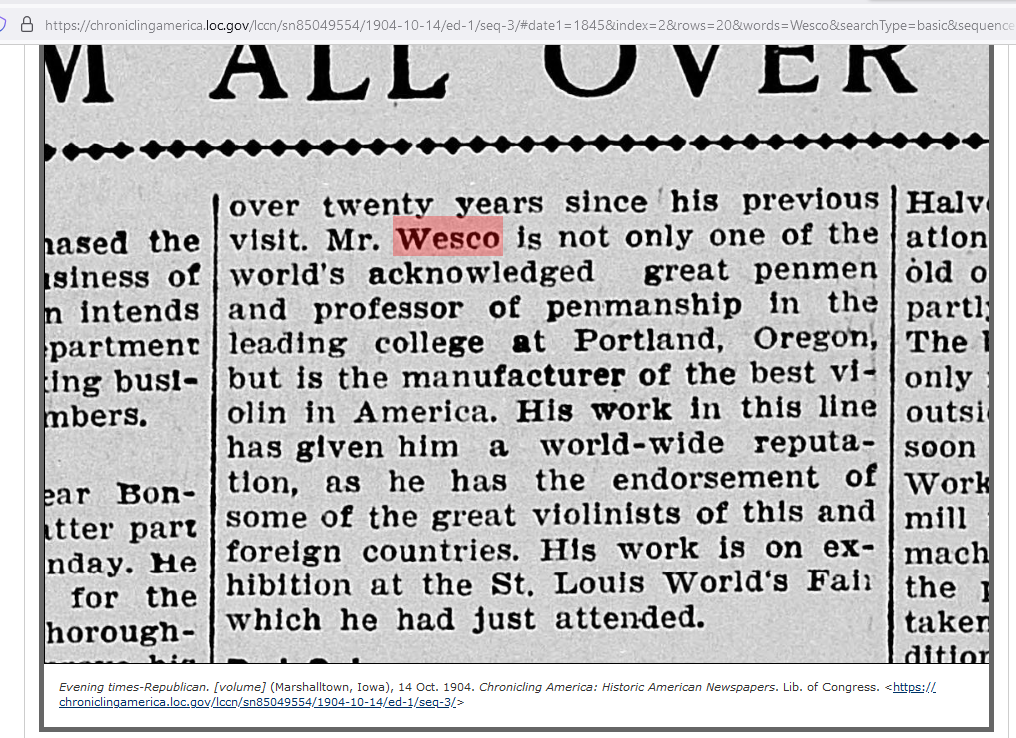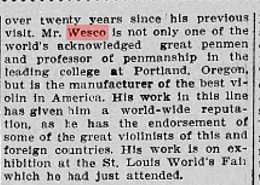 Mr. Wesco created the 'Wesco System of Writing', teaching penmanship in the early 1900's as a professor. He also traveled to Boston to learn violin making.
