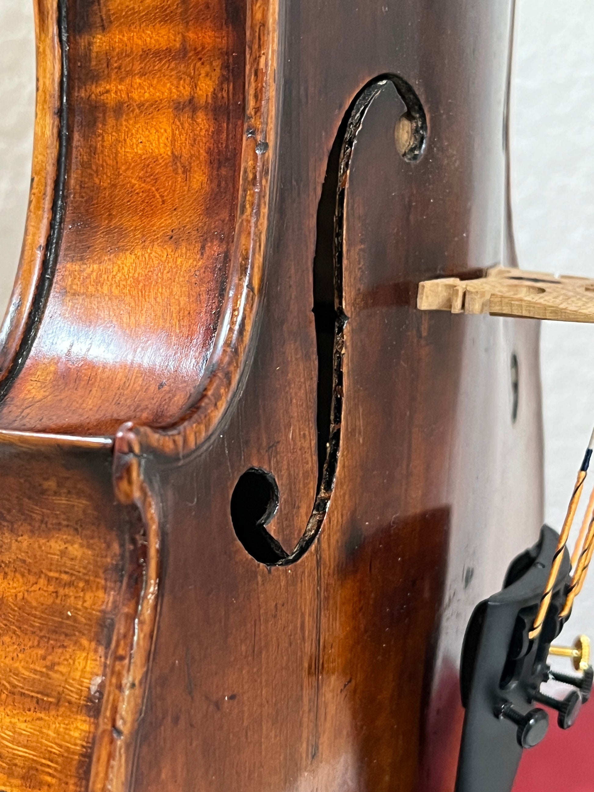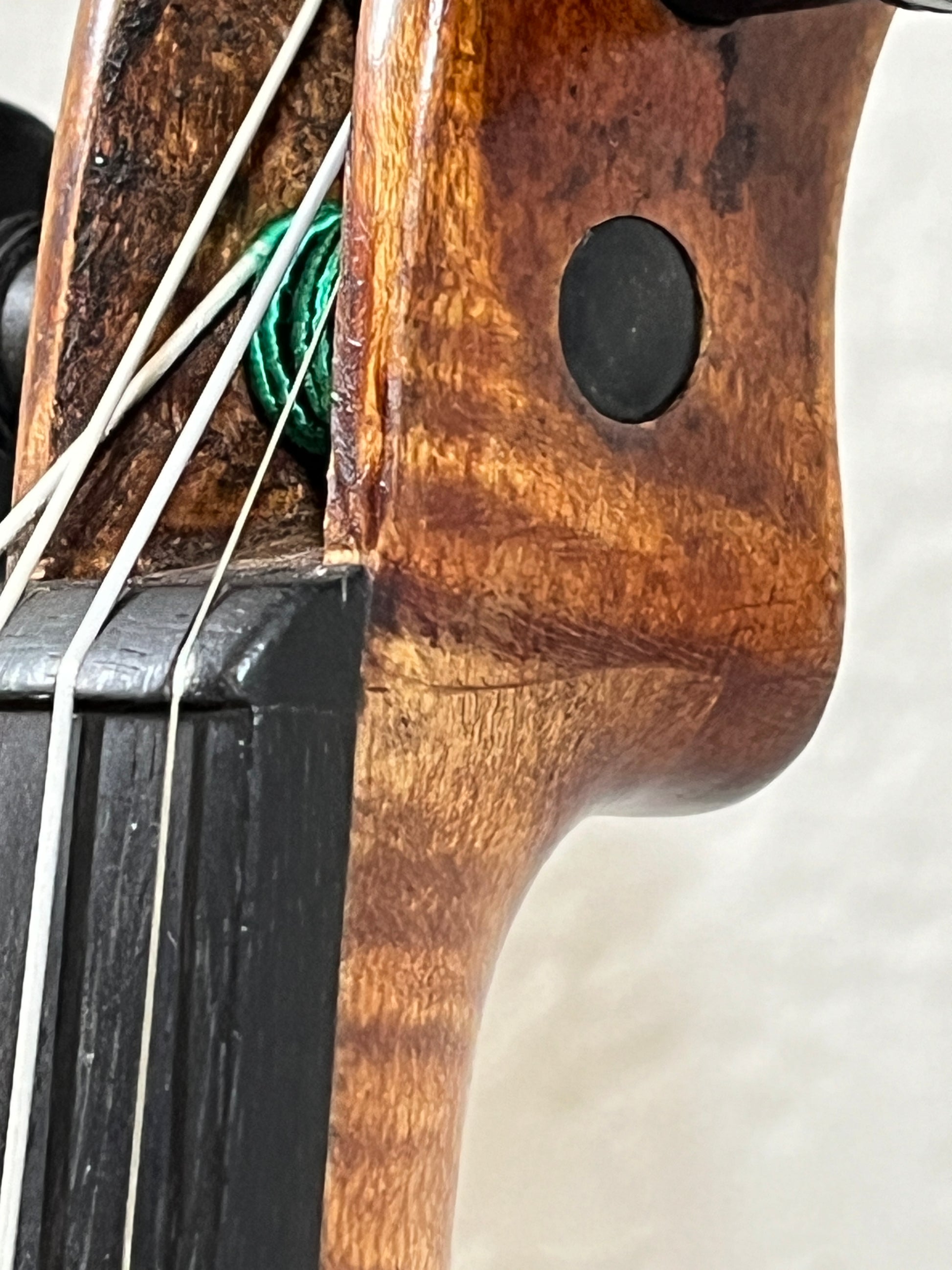 The repairs have been expertly cleated and tidied, with a grafted neck on the violin to suit the body