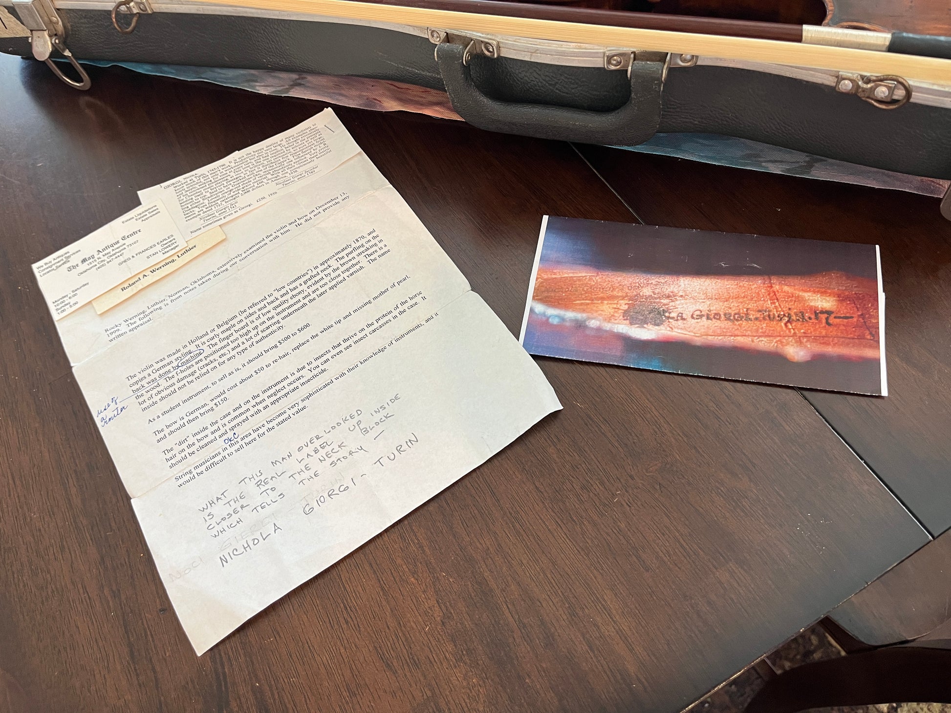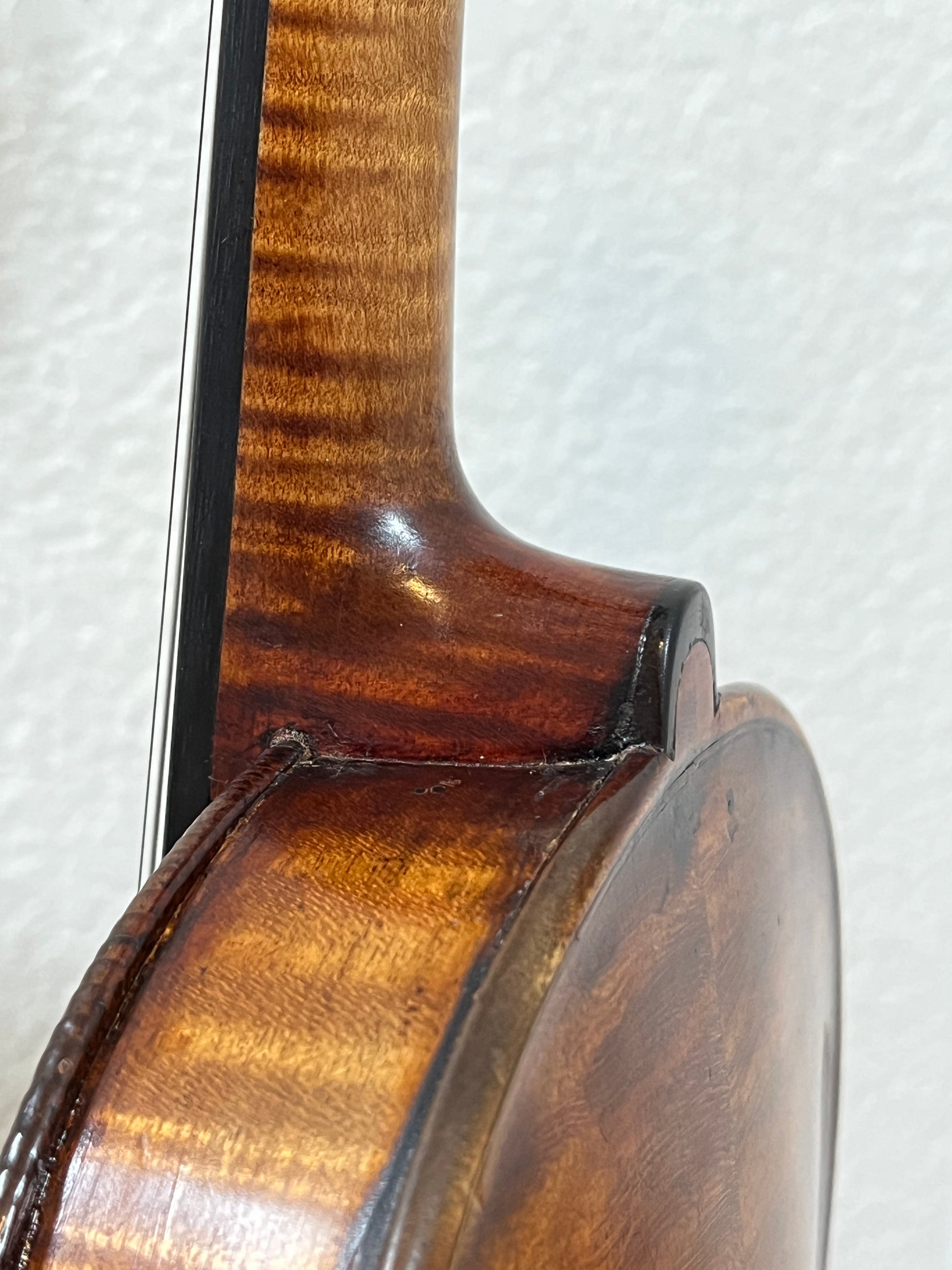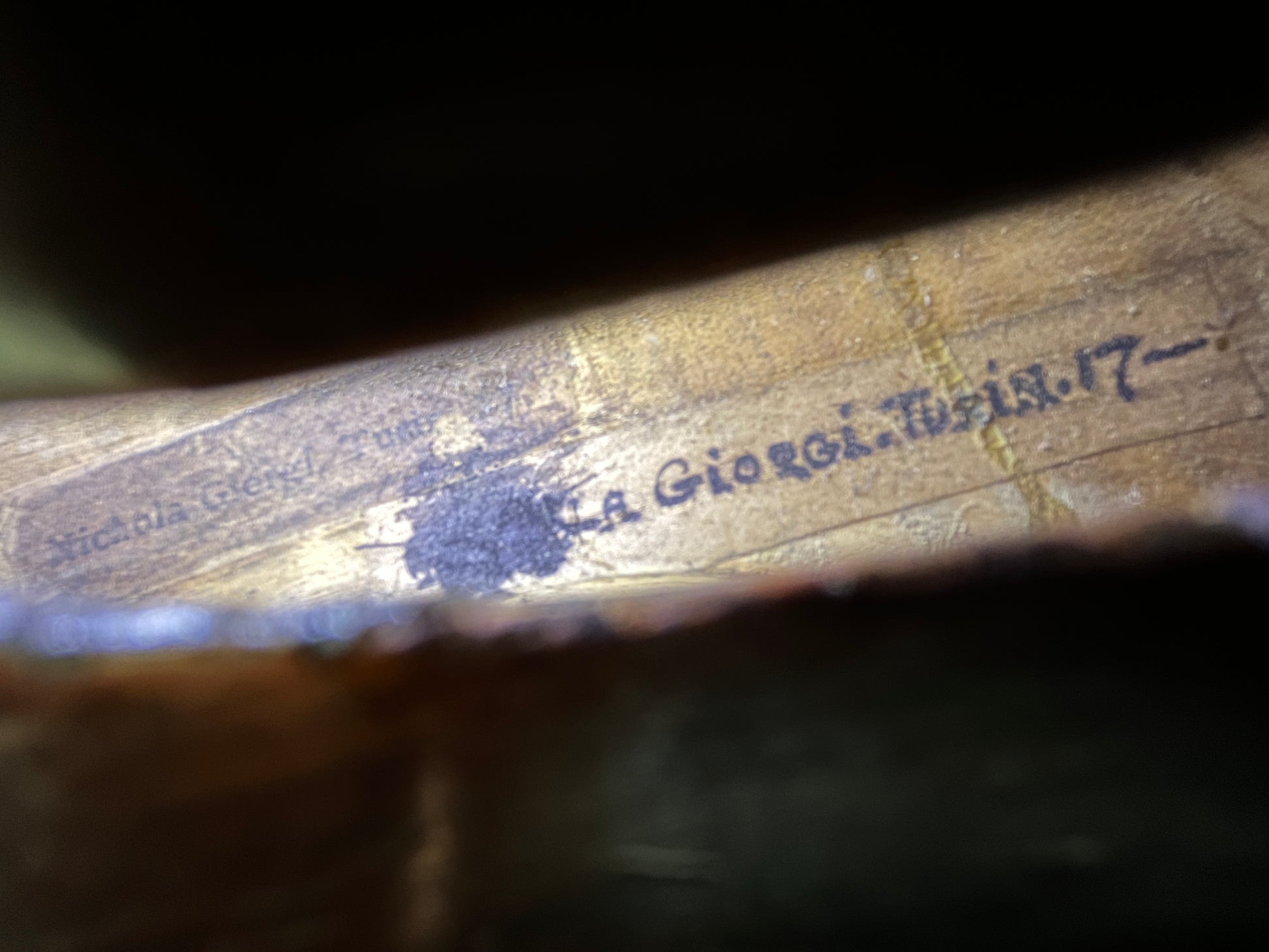 Grafted neck, Violin has 2 labels inside - they appear to state: Nichola Giorgi Turin 17- it is full of vintage looks, feel, sound, smell and grabs attention everywhere it goes.