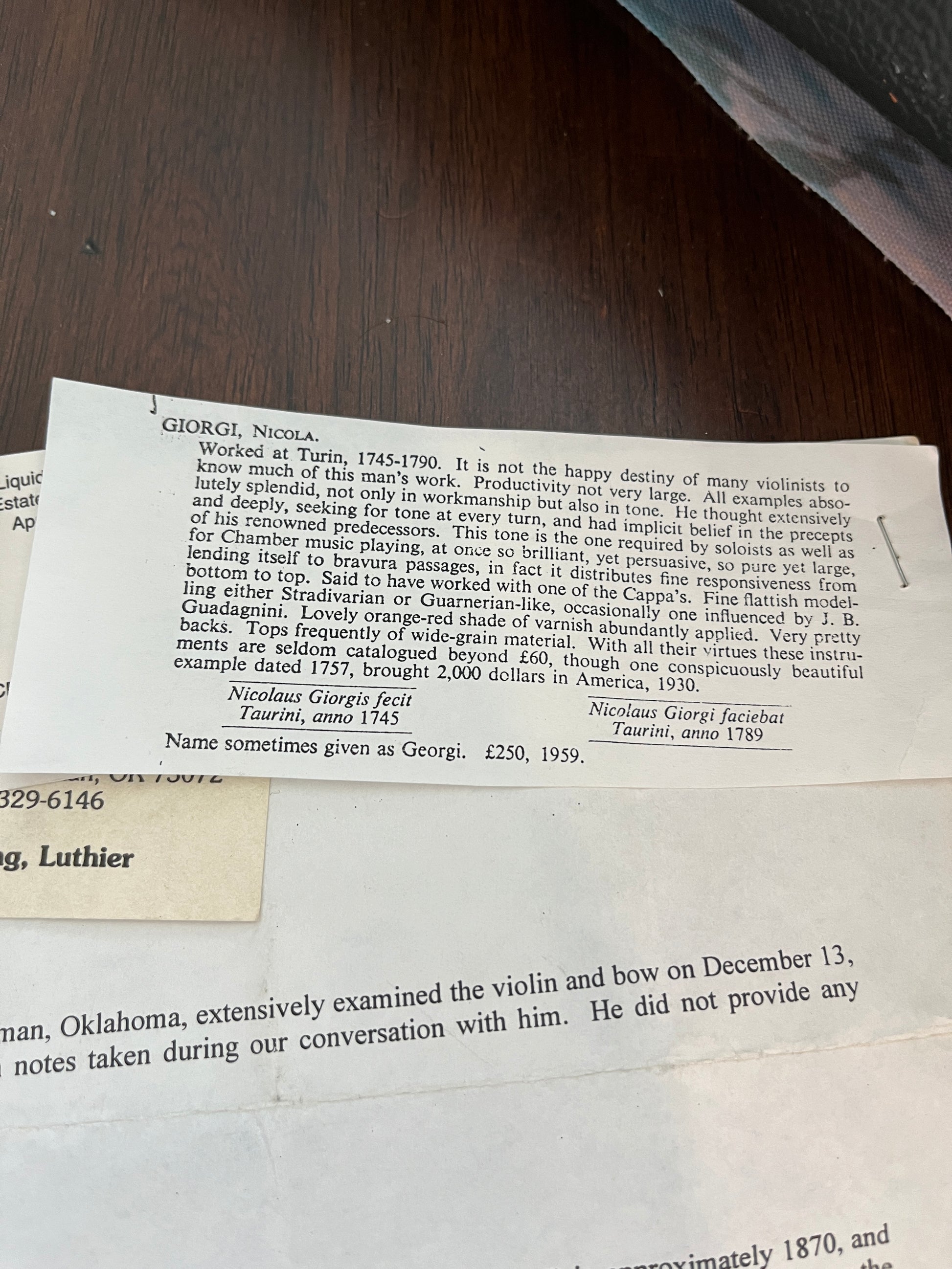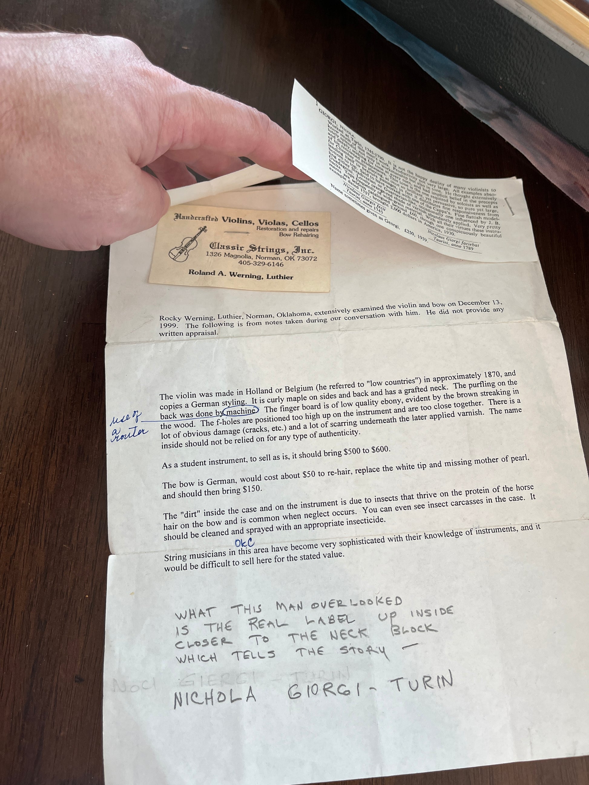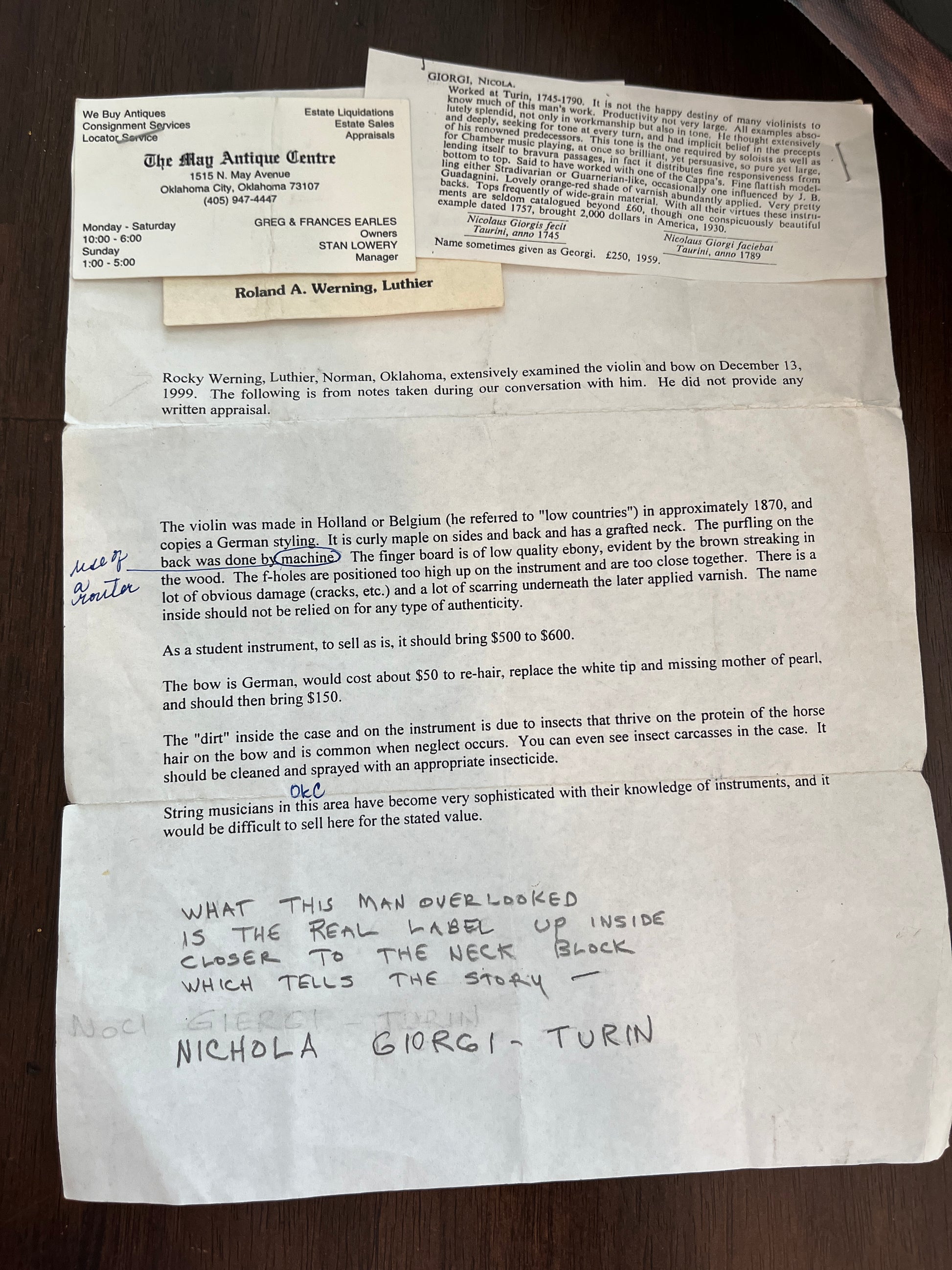 Grafted neck, Violin has 2 labels inside - they appear to state: Nichola Giorgi Turin 17- it is full of vintage looks, feel, sound, smell and grabs attention everywhere it goes.