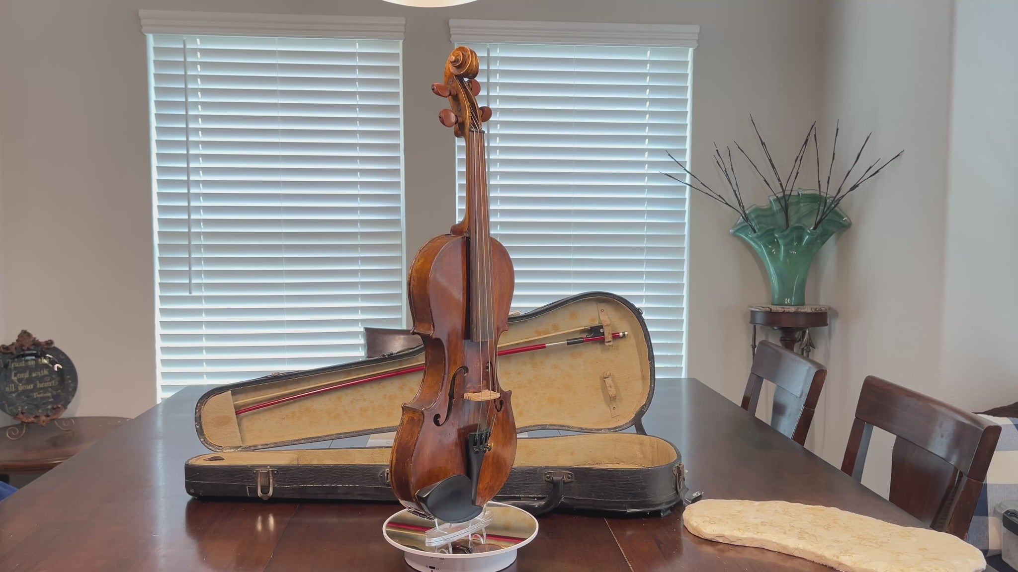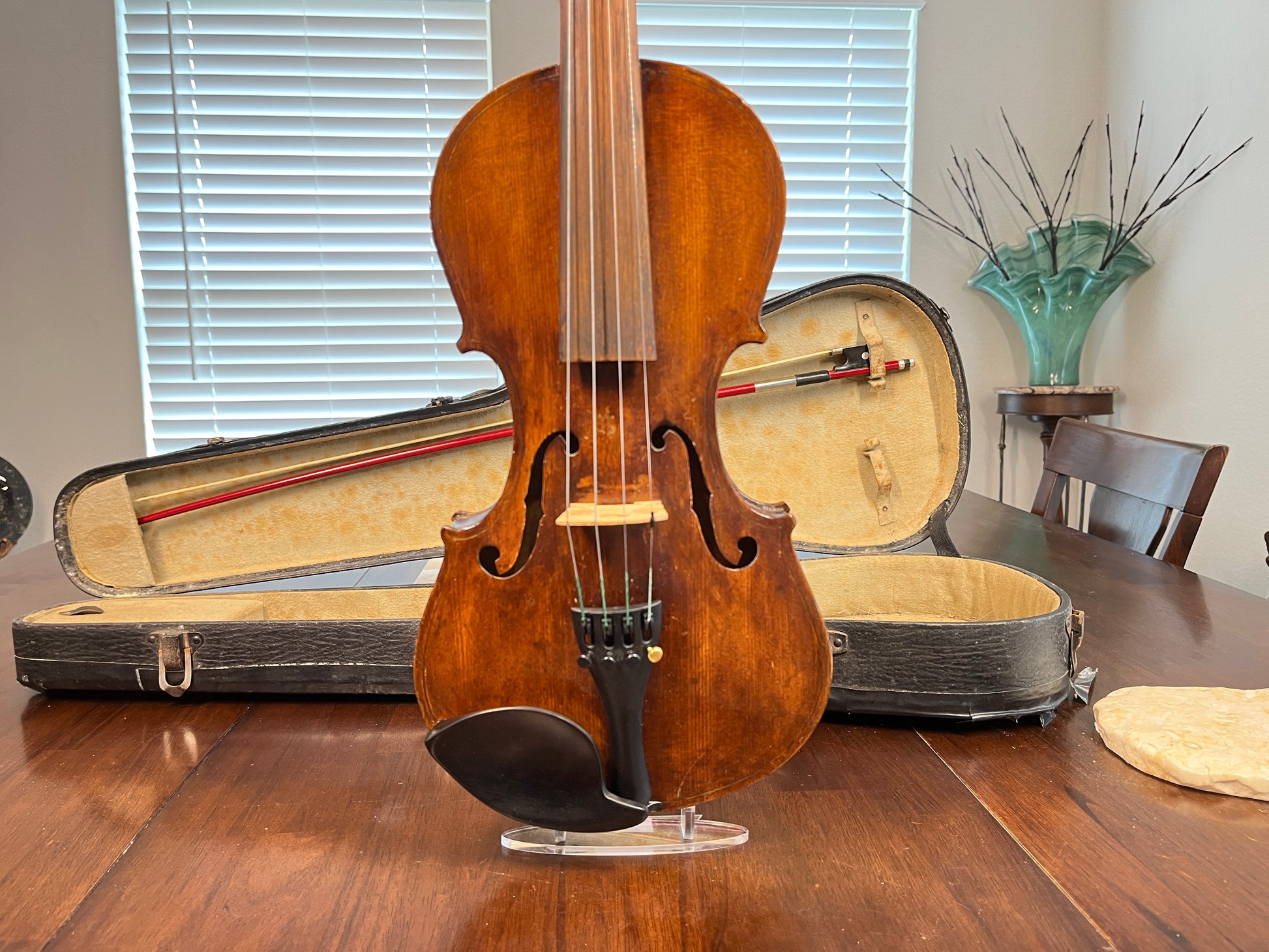 Why purchase new or rent when pre-owned sounds just as good! Did you know you can buy a quality pre-owned violin like this, and typically sell for the same price if kept in good condition? It’s like having a violin for free. You’re welcome to play prior to purchase. I’m happy to meet at a local music store in Burleson for a second opinion. We’re located in South Fort Worth, Texas. We look forward to meeting you! Shipping is protected, so if what you get, doesn’t meet the description you can send it back.