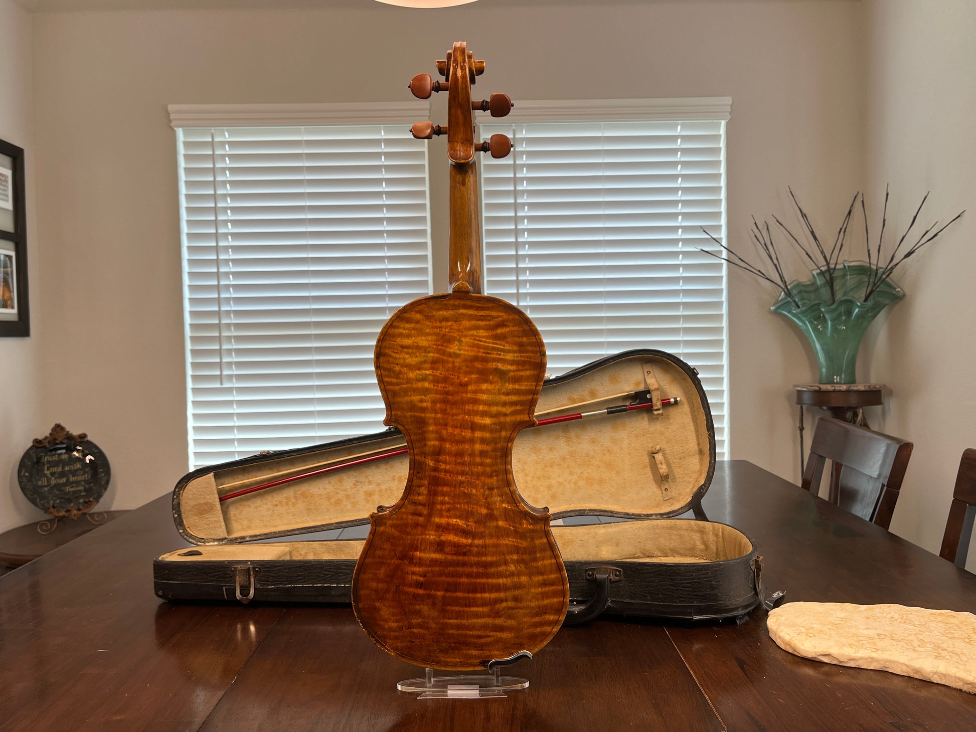 The previous owner was the seller's mother who had passed away. She adored this violin and it hung in there home for roughly 50 or more years.